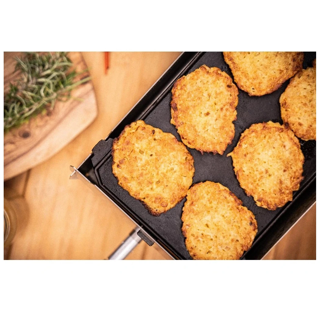 Чавунна пательня є двосторонньою. Одна сторона має рифлену поверхню для класичного грилювання, тоді як інша є гладкою та ідеальною для млинців, яєчні або морепродуктів. Установка дуже проста, просто покладіть на решітку гриля SKOTTI. Масивна чавунна конструкція забезпечує тривалий термін служби та надає їжі чистий, природний смак без небажаного пригорання. Крім того, вона стійка до зовнішнього середовища або дощу.