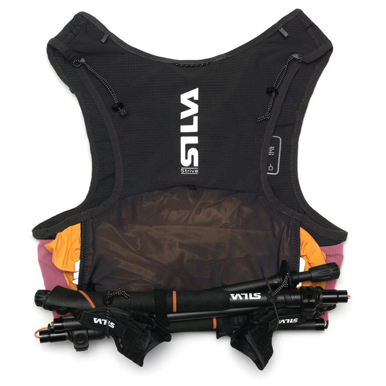 На спині є дві кишені - нижня поздовжня кишеня та основна задня кишеня, яка має два виходи для кабелю налобного ліхтаря або шлангу гідратаційного мішка. Невелика кишенька всередині призначена для фіксації акумулятора. Палиці можна прикріпити за допомогою гнучких регульованих петель або покласти в сумку Silva Quiver, яка полегшує виймання палиць з жилета під час перегонів (сумка не входить до комплекту).