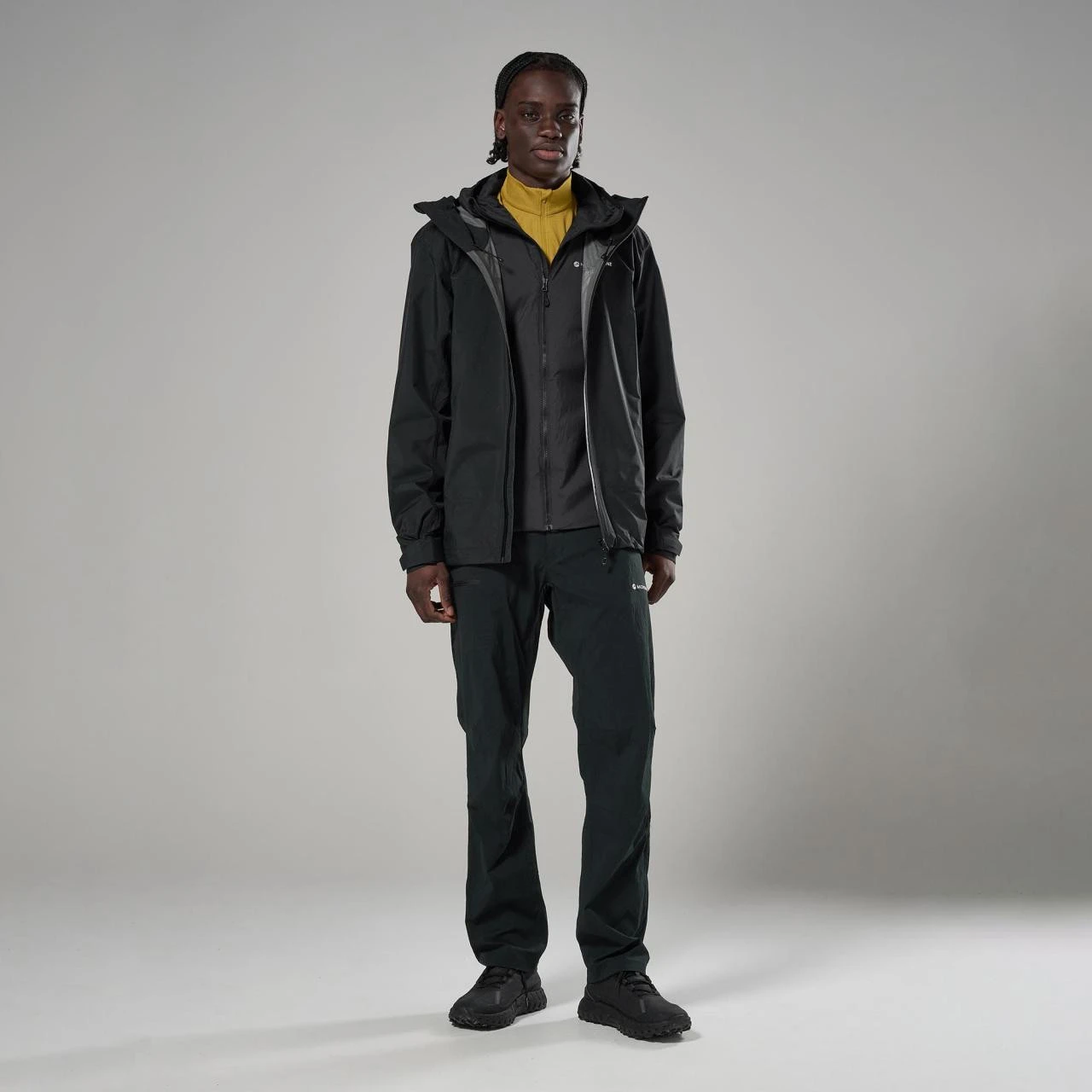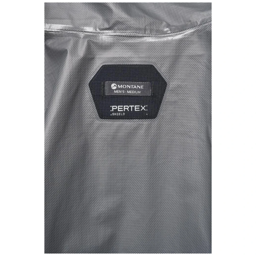 Основою є матеріал Pertex® Shield 2,5 L, який поєднує перероблену тканину ripstop 40D з водонепроникною та вітронепроникною мембраною. Внутрішня трикотажна підкладка 20D приємна на дотик і підвищує комфорт під час носіння. Конструкція розроблена з акцентом на малу вагу та функціональність, при цьому обмежена кількість швів допомагає підвищити стійкість і одночасно підтримує повітропроникність під час активного руху.