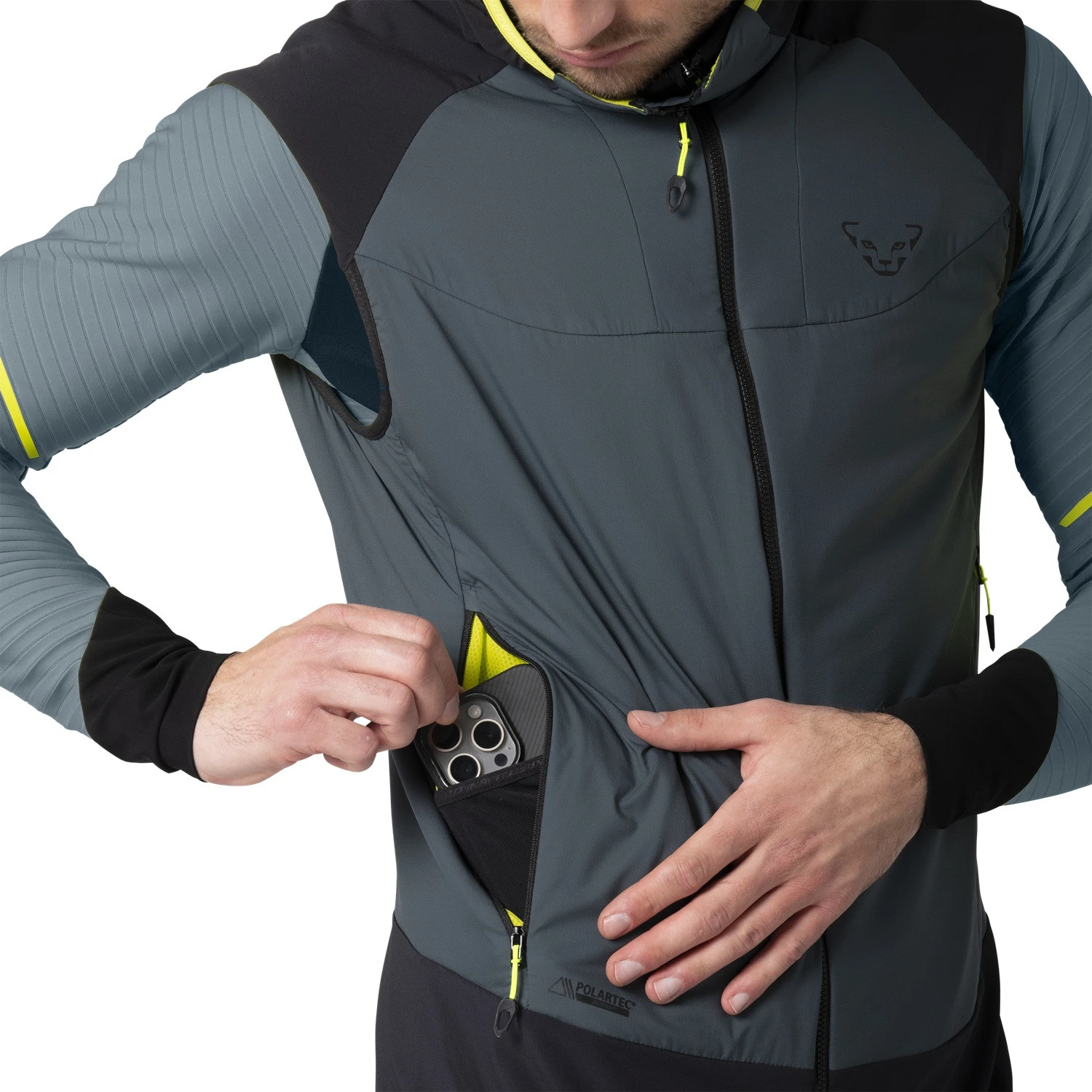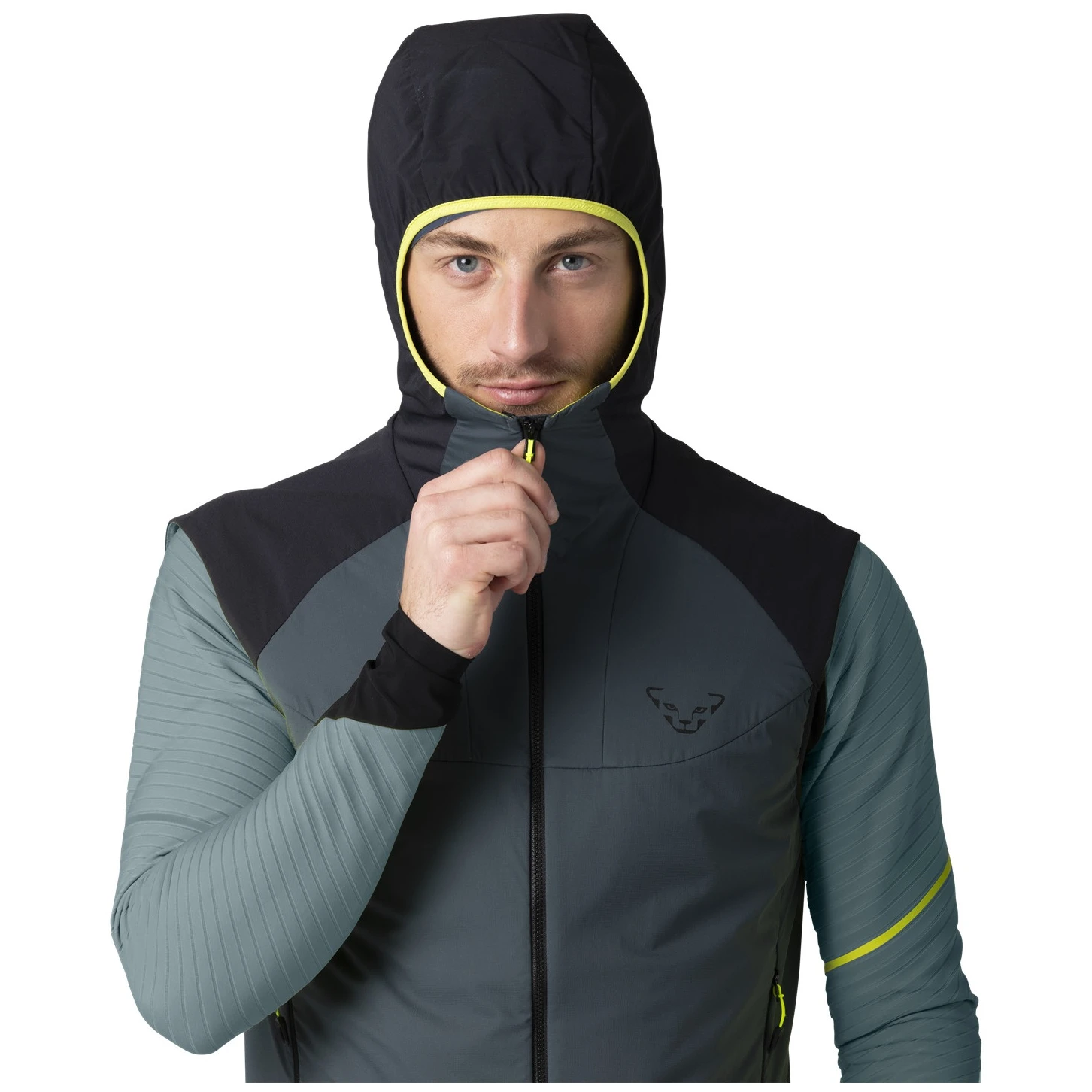 У місцях, де ви носите рюкзак на спині, ізоляція замінена перфорованою, еластичною тканинною вставкою для додаткової повітропроникності. Жилетка пропонує прилягаюче носіння та оснащена еластичними вставками для ідеальної форми без ковзання під час інтенсивного руху. Дві передні кишені на блискавці пропонують місце для зберігання дрібних предметів, таких як телефон або перекус.