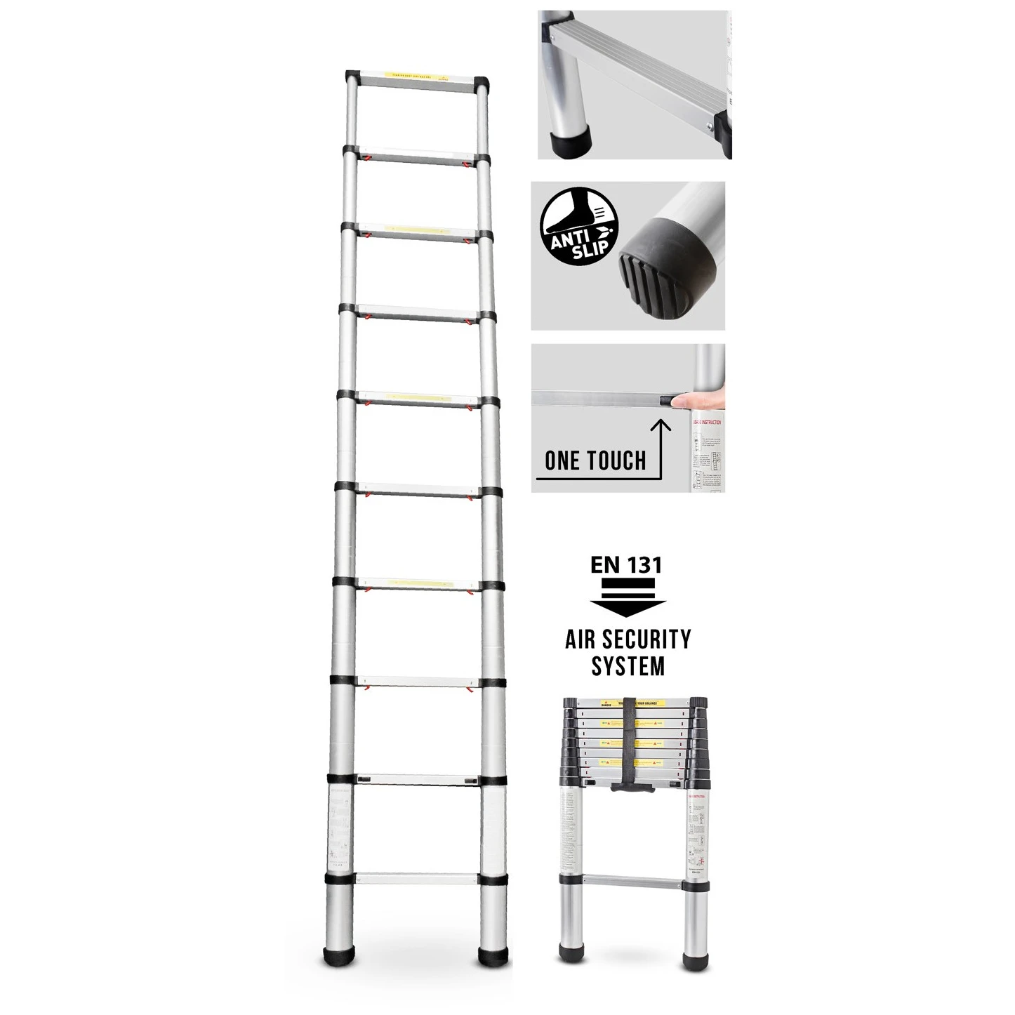 Телескопічна алюмінієва драбина Laddy Air від бренду Brunner з новорозробленою технологією повітряного демпфування, яка усуває ризик травмування пальців. Легко транспортується і регулюється по висоті. Оснащена протиковзкими гумовими накладками для підвищення безпеки. Компактне зберігання.