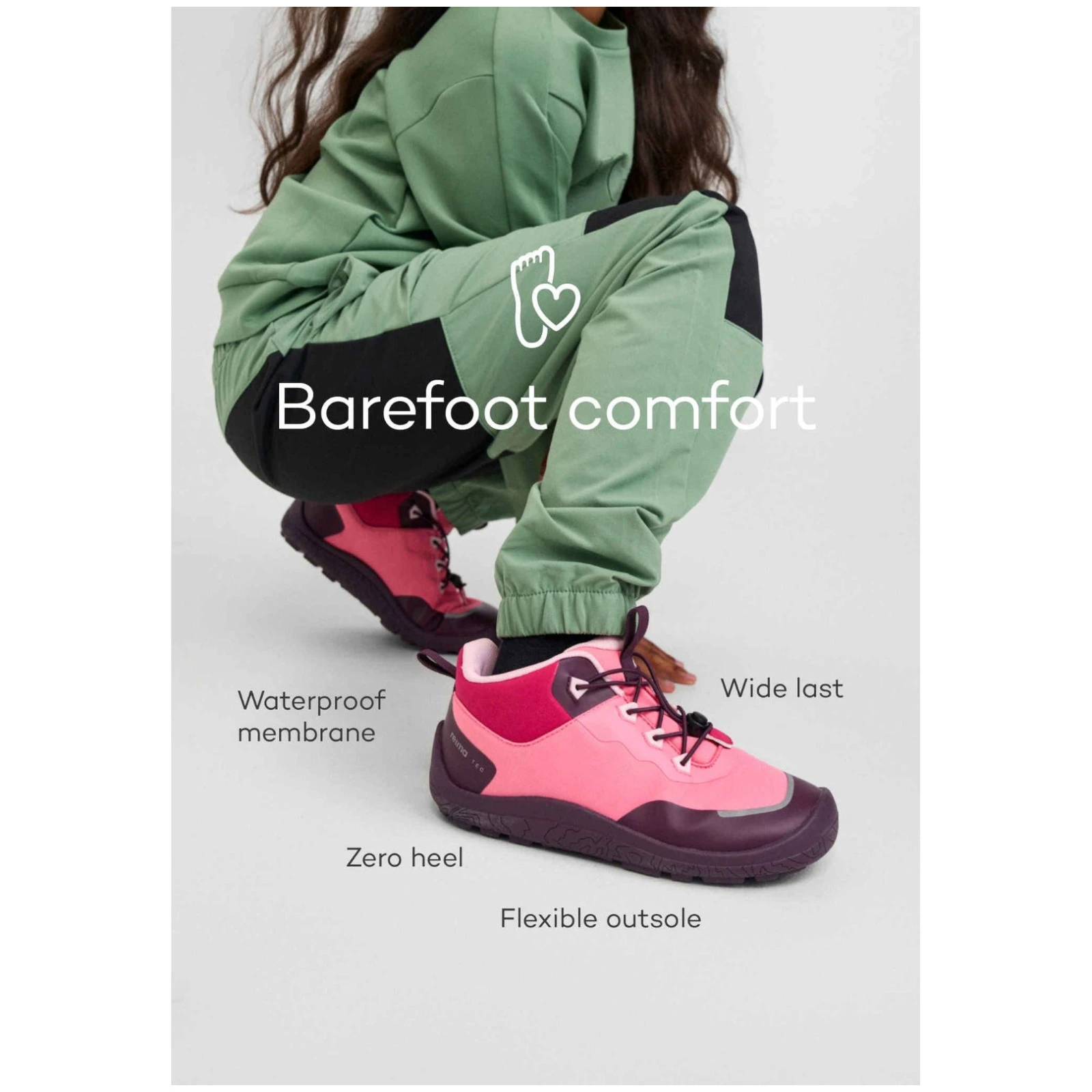 Дитячі універсальні barefoot черевики Reima Sankari ідеально підходять для прогулянок містом або на природі навіть у несприятливу погоду.