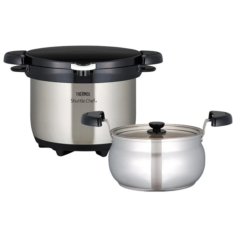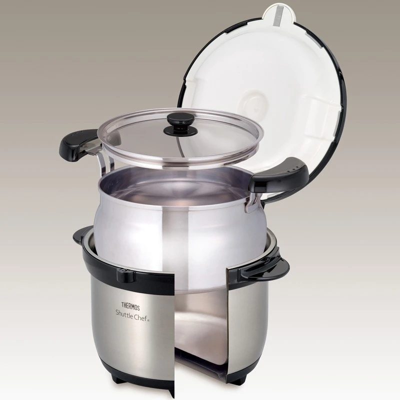 Термос Thermos Shuttle Chef – це термос із вакуумною ізоляцією, призначений для економного, здорового та зручного приготування їжі без необхідності постійного нагляду. Був представлений в Японії ще в 1989 році, і з тих пір завоював велику популярність серед любителів активного відпочинку завдяки легкого приготування страв на дачах, в кемпінгу або під час сімейних зустрічей на задньому дворі. Він чудово підійде і для звичайного приготування їжі вдома. Його принцип полягає в короткому нагріванні страви на звичайній плиті, а потім доведенні до готовності шляхом підтримки власної температури в ізольованій ємності, без додаткового джерела енергії.