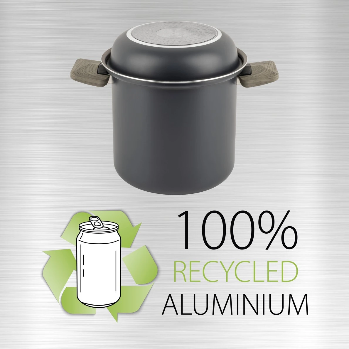 Набір посуду Torralta Ø 20 см від бренду Brunner пропонує оптимальне співвідношення площі та об'єму. Завдяки спеціальному дизайну країв він стоїть надійно і без ризику зісковзування. Усі каструлі та сковорідки виготовлені з перероблених алюмінієвих банок.