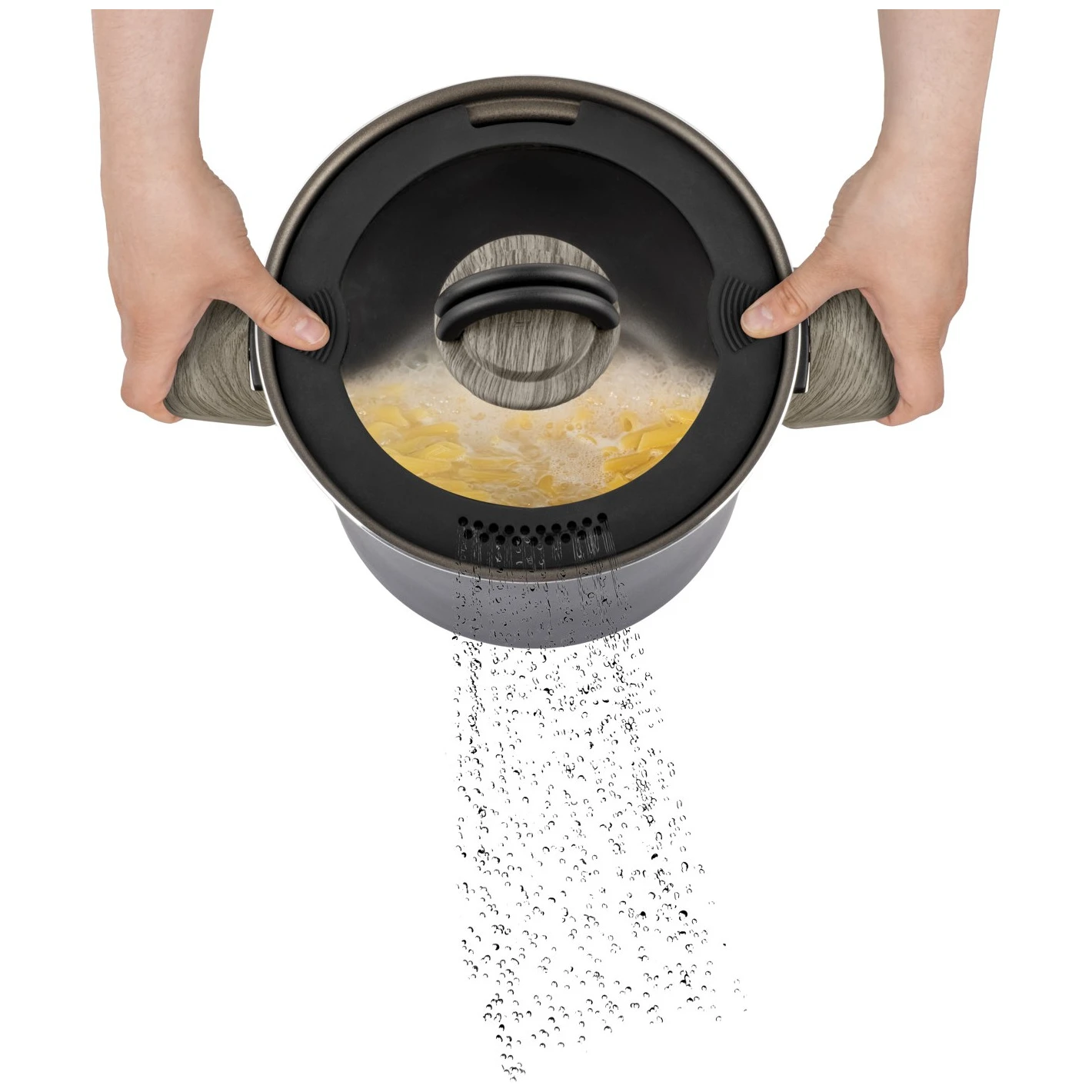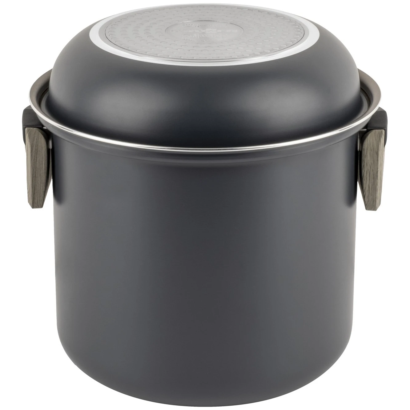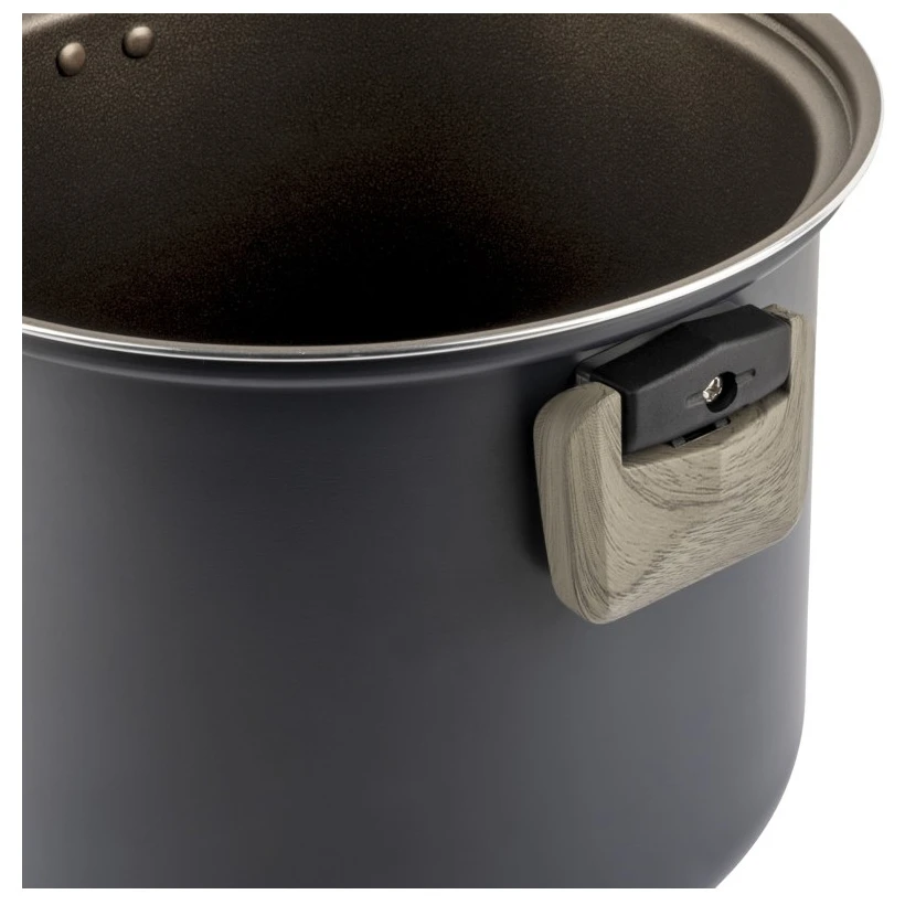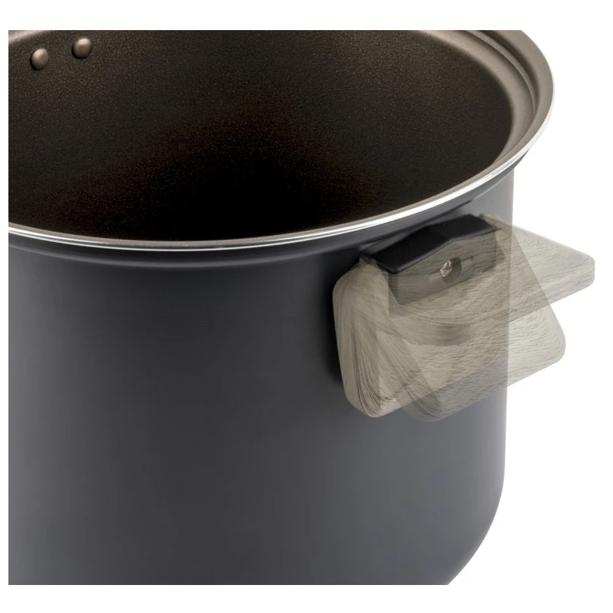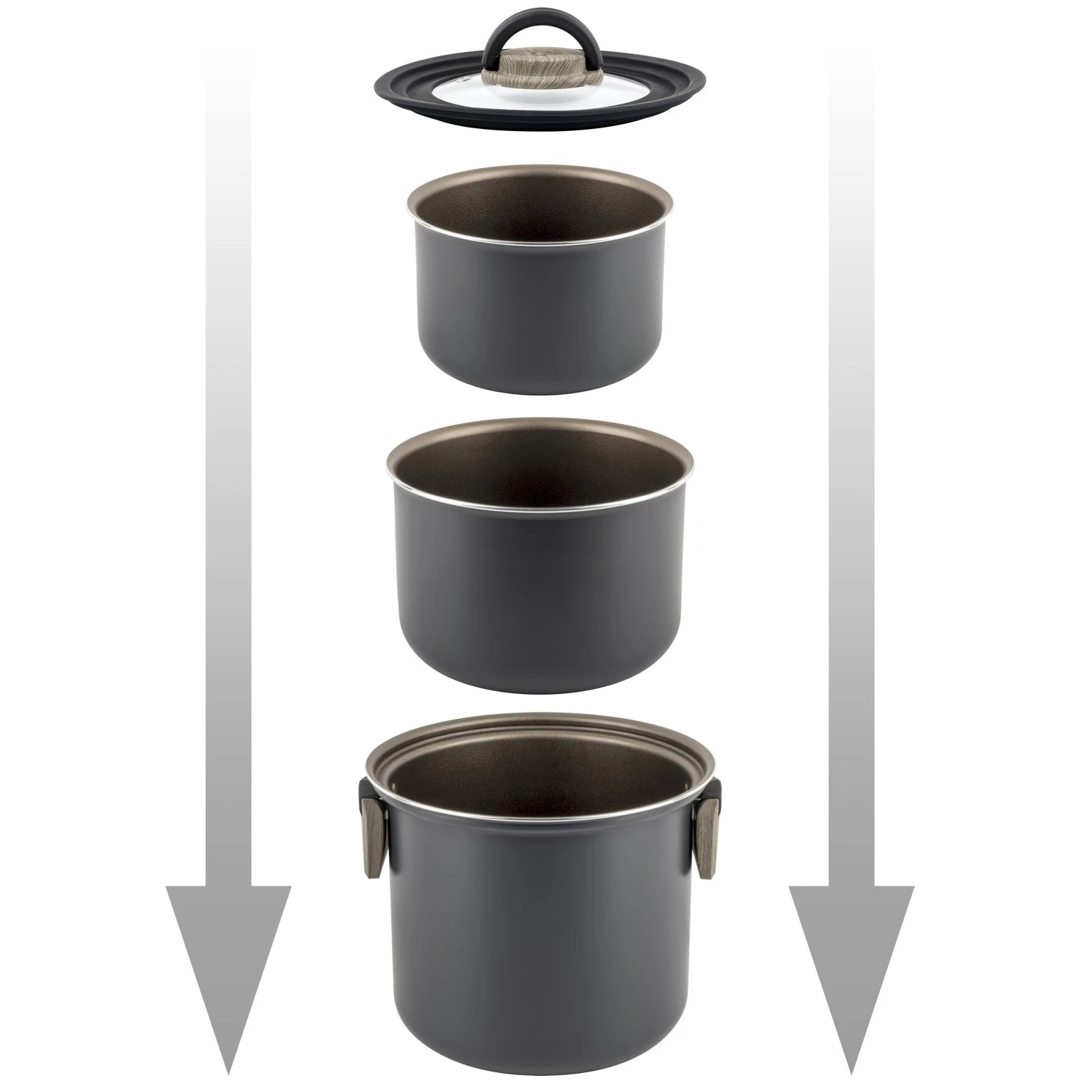 Зовнішня каструля/сковорода має складні ручки для компактного та економного зберігання. Цей універсальний набір сумісний з усіма типами варильних поверхонь, включаючи індукційні. До комплекту входить знімна ручка для внутрішніх каструль і сковорідок.