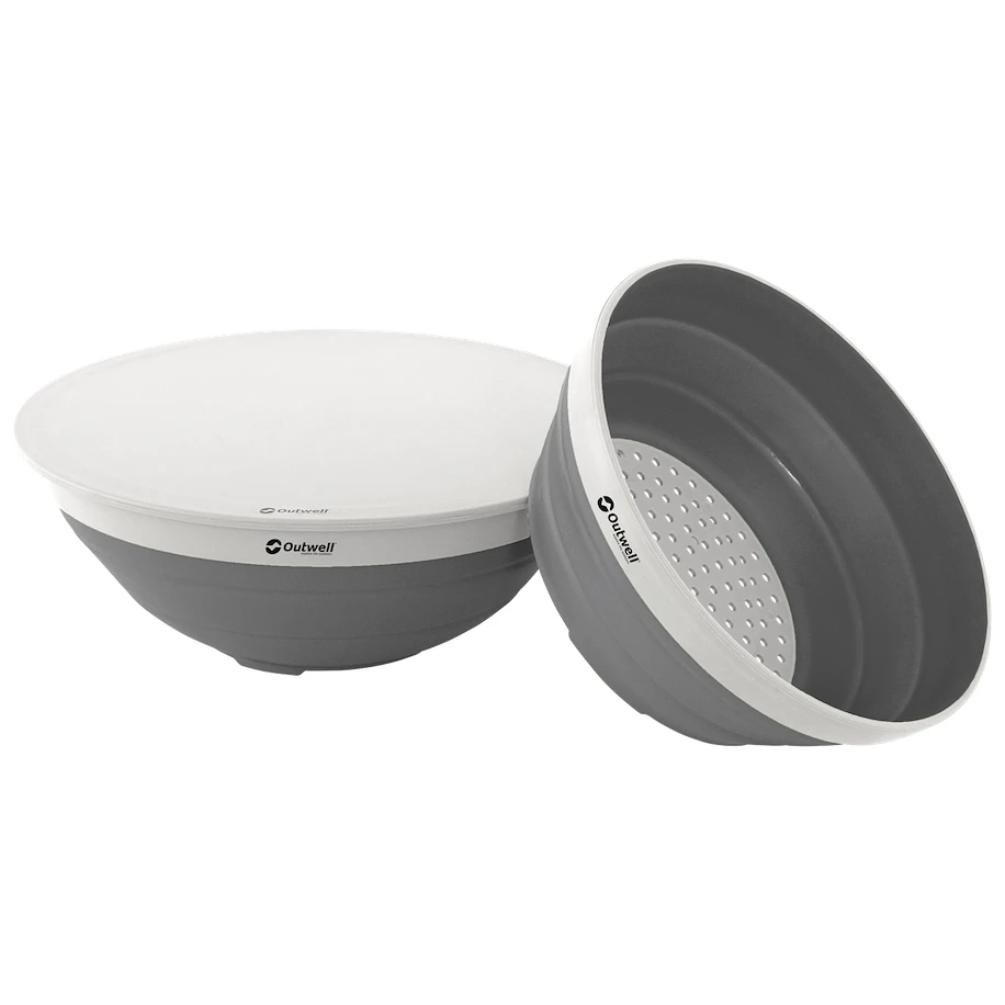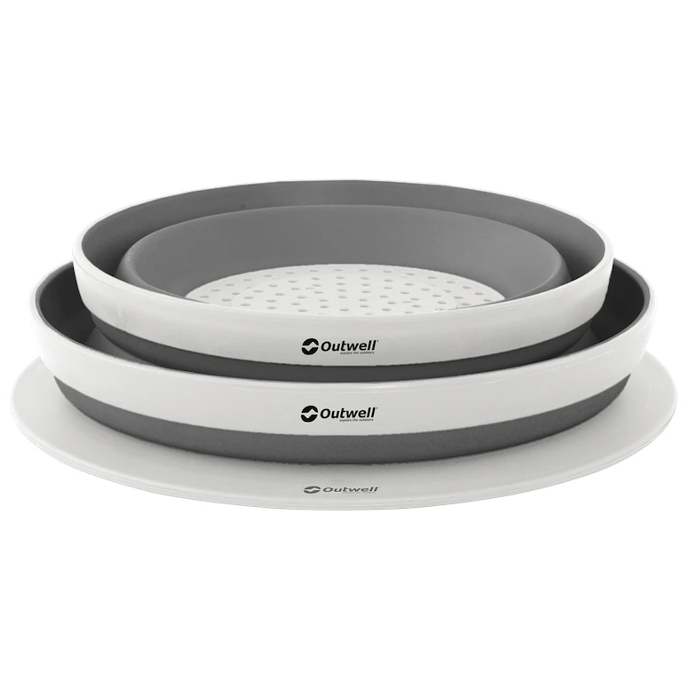 Якщо ви шукаєте дуже компактний посуд, і в той же час вони стійкі до поломки, то датський бренд Outwell запропонував набір Collaps Bowl & Colander Set. Набір містить невелику миску розміром 8,5 x 20,5 см, друшляк розміром 9 x 23,5 см та кришку розміром 0,5 x 29, яку також можна використовувати як обробну дошку. Весь комплект можна скласти в компактні розміри 6,5 х 29, які практично не займають місця. Миски виготовлені з TPE і пластику і не містять ніяких шкідливих речовин BPA. Посуд можна мити в посудомийній машині, не підходить для мікрохвильової печі.