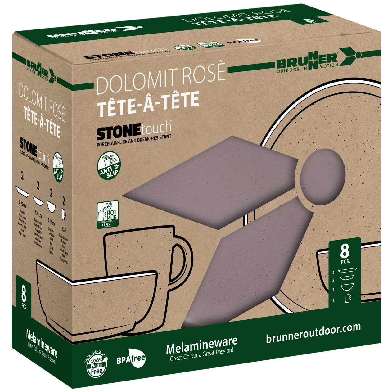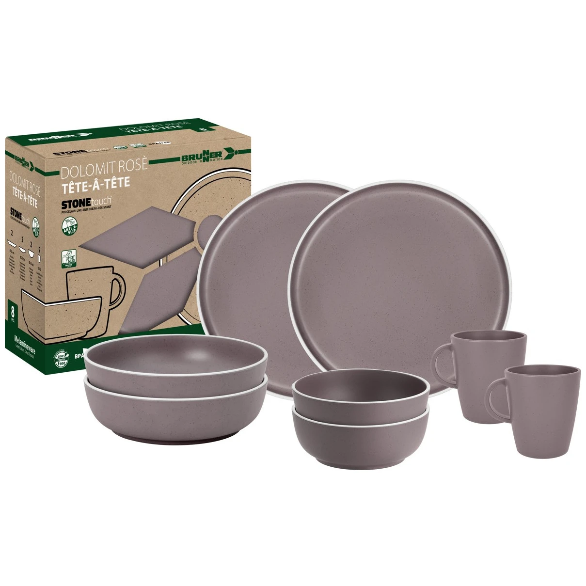 Набір Dolomit Set tete-a-tete від Brunner містить найнеобхідніше спорядження для кемпінгу. Набір складається з 8 штук і розрахований на 2 осіб. У кемпінгу ви оціните підвищену міцність завдяки меламіну. Цей матеріал ударостійкий, легко чиститься, термо- і вологостійкий, не має запаху і смаку, екологічно чистий. Посуд можна ставити в морозильну камеру та мити в посудомийній машині.