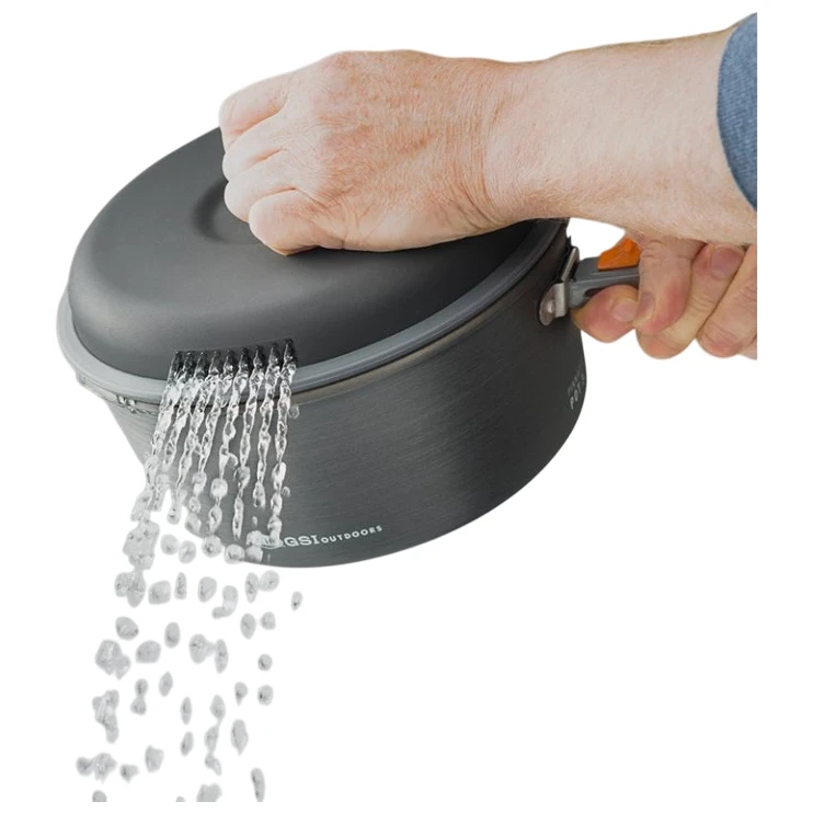 Посуд виготовлено з твердого анодованого алюмінію з керамічним антипригарним покриттям для зручного приготування їжі та легкого очищення. Компактний дизайн дозволяє зберігати все спорядження в одному міцному мішку, який також служить як раковина або умивальник. Складаний тримач для каструль надійно кріпиться ззовні, щоб не подряпати поверхню посуду.