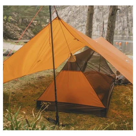 Водонепроникне міцне дно виготовлене з ripstop нейлону, покритого поліуретаном, з водостійкістю 5000 мм. Завдяки цьому він збереже вас сухими та комфортними. Тент виготовлений з ультралегкої нейлонової сітки щільністю 16 г/м², яка дуже добре пропускає повітря. Частина стін суцільна, тому захищає від протягів. Сама конструкція складається з туристичних палиць (не входять до комплекту).