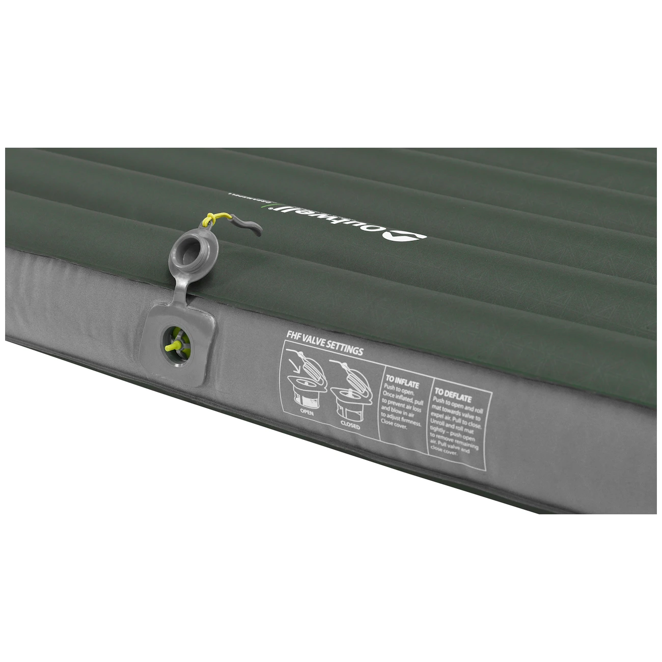 Надувний матрац для двох осіб Дрімспелл Дабл від данської фірми Outwell виготовлений з міцного поліестеру, який покритий ПВХ. 3D конструкція з горизонтальними каналами допомагають забезпечити рівномірний розподіл ваги, а отже, стабільність і комфорт під час сну. Подвійний, добре ущільнюючий клапан подбає про швидке та правильне надування.