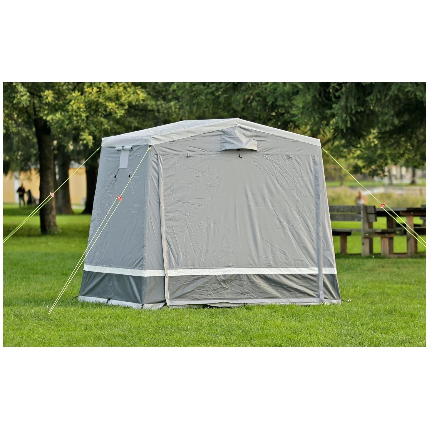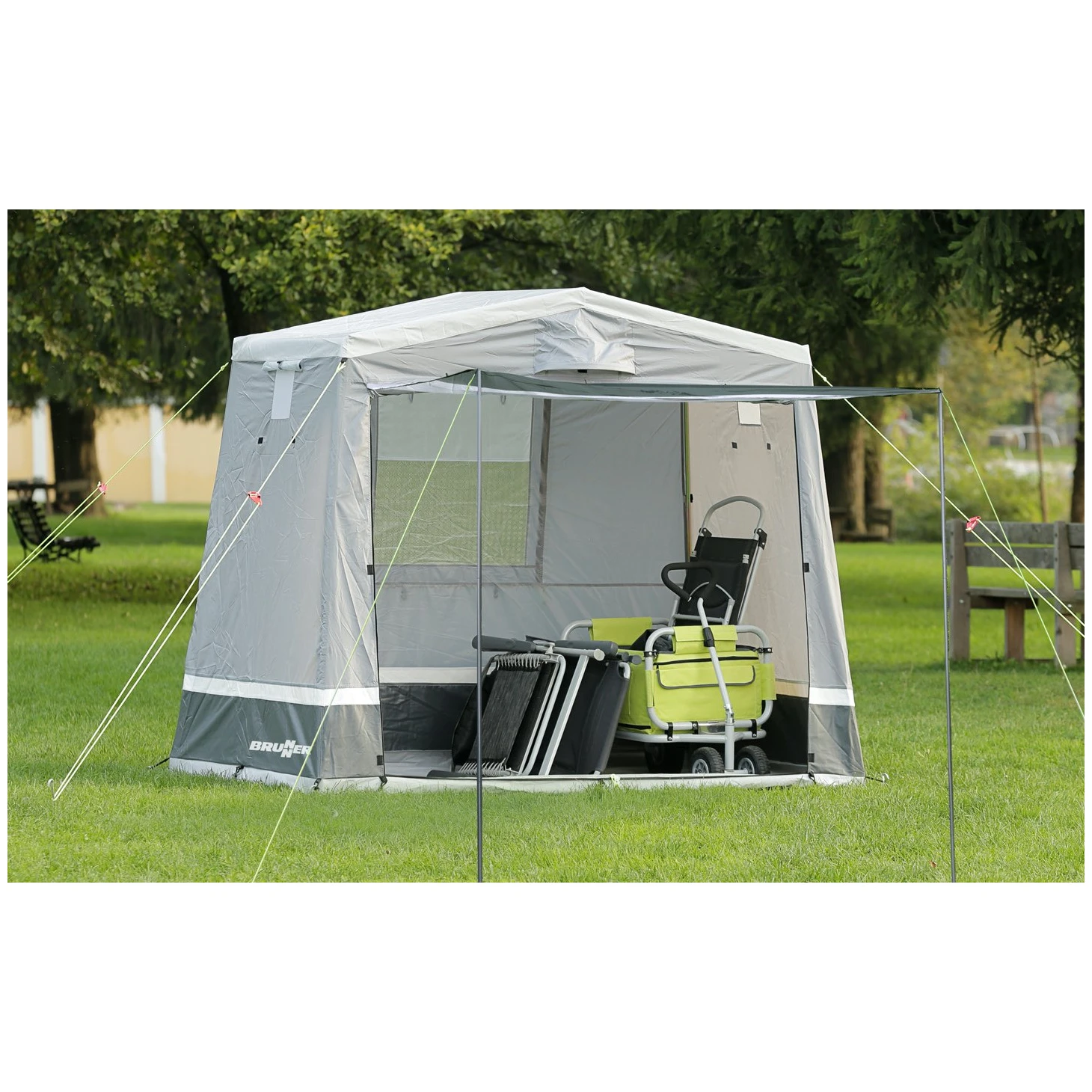 Storage Plus від Brunner - це практичний намет для зберігання, в якому можна зберігати кемпінгові меблі, кемпінгові візки, велосипеди чи будь-яке інше спорядження. Намет складається зі сталевої конструкції, яка доповнена високоміцним тропічним тентом з проклеєними швами. Потім дах складається з поліефірної тканини, покритої з обох боків.