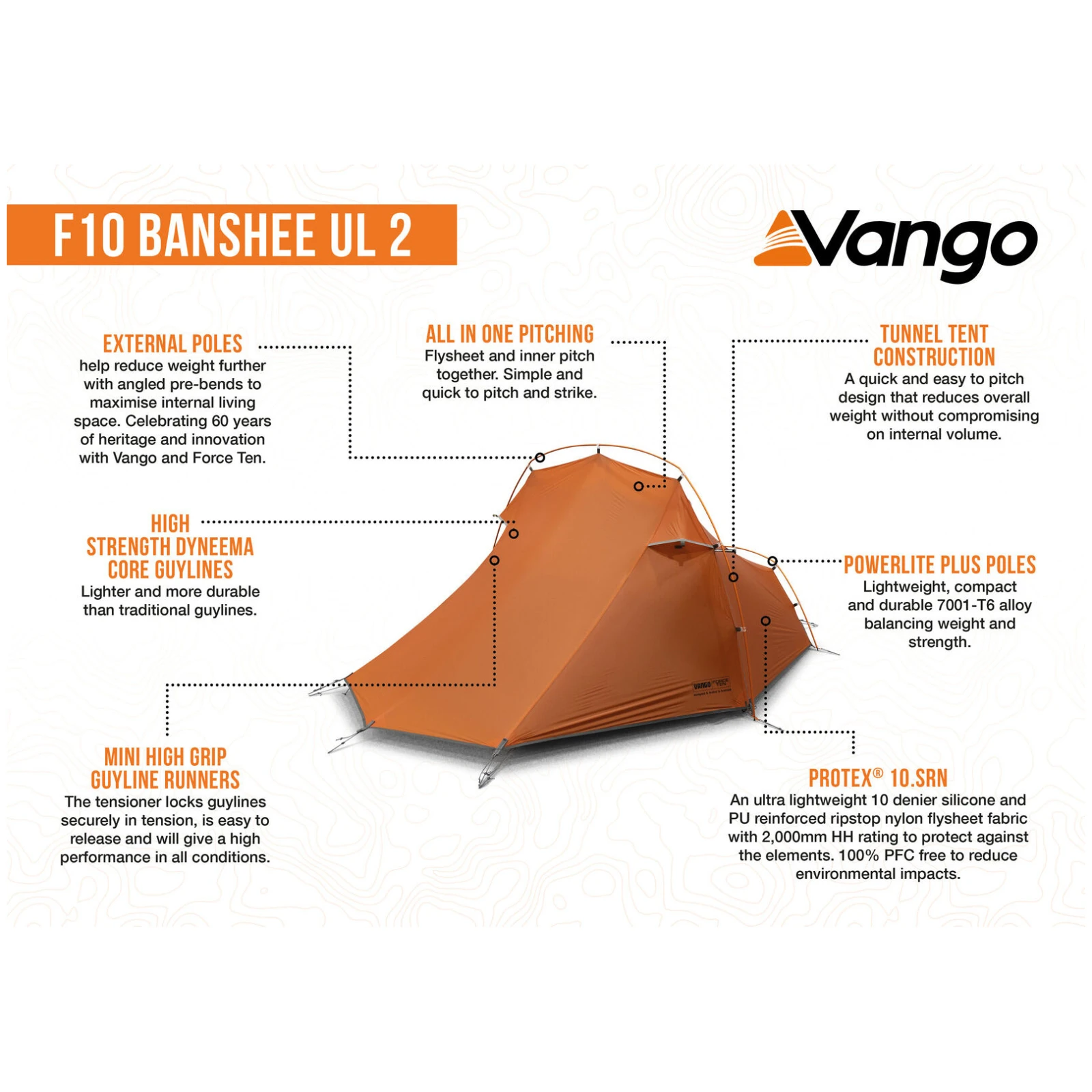 Намет Force Ten Banshee UL2 є сучасним втіленням легендарної моделі Banshee, яка вже десятки років захищає мандрівників у горах, долинах і на узбережжі. Тунельна конструкція дозволяє швидко та легко встановити намет, одночасно зменшуючи загальну вагу без обмеження внутрішнього простору. Завдяки системі „все в одному“ внутрішній намет залишається прикріпленим до зовнішнього, що значно прискорює встановлення та пакування. Намет можна встановити і без внутрішньої частини як мінімалістичний навіс.