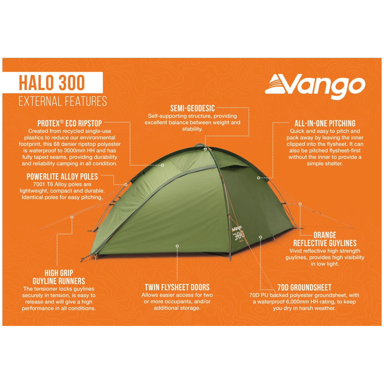 Намет Halo Pro 300 від виробника Vango – це напівгеодезичний тримісний намет, який є ідеальним балансом між низькою вагою, міцністю та внутрішнім комфортом. Завдяки трьом однаковим дугам PowerLite з алюмінієвого сплаву 7001-T6 виходить самонесуча конструкція, яка є дуже стабільною, легко встановлюється та добре протистоїть вітру та несприятливій погоді. Зовнішній тент Protex Eco Ripstop виготовлений з перероблених пластиків з гідростатичним напором 3 000 мм та повністю проклеєними швами.