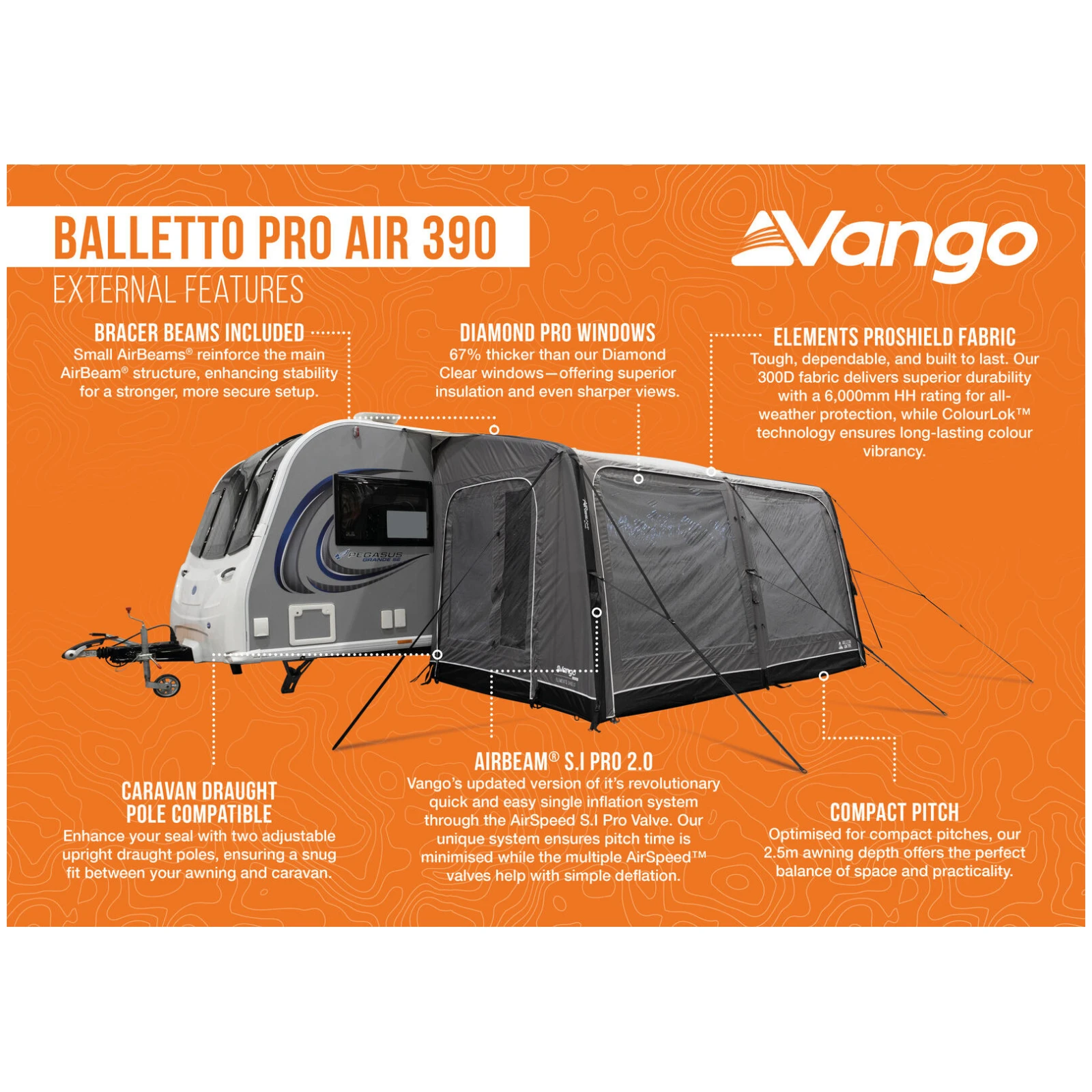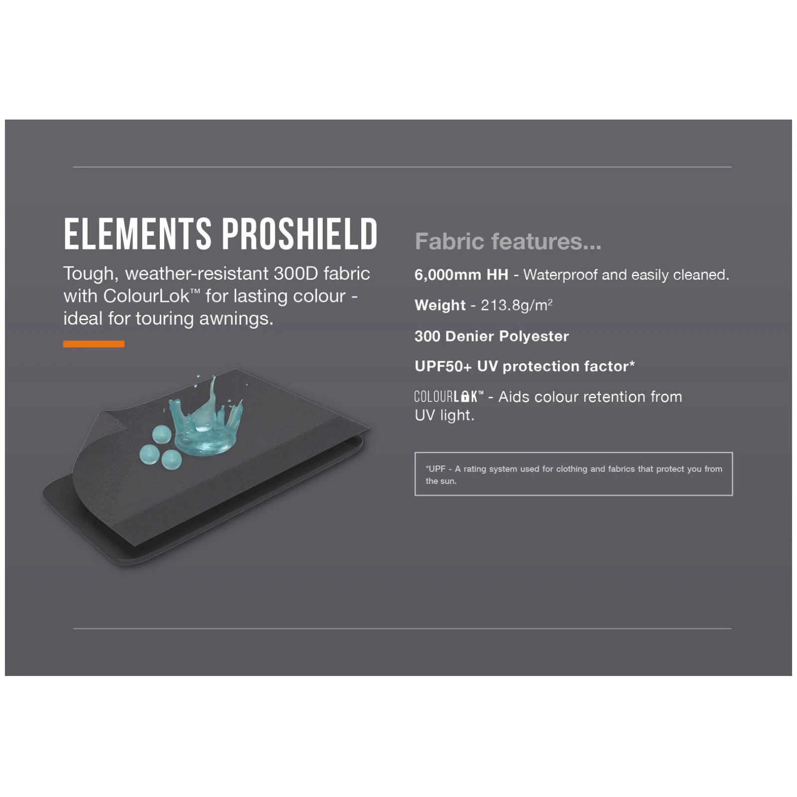 Маркіза виготовлена з високоміцної тканини Elements ProShield 300D з водостійкістю 6 000 мм, яка надійно захищає від дощу та вітру. Технологія ColourLok допомагає зберегти насичені кольори навіть при тривалому впливі УФ-випромінювання. Великі вікна Diamond Pro забезпечують чудовий вид на околиці, достатньо денного світла та кращу теплоізоляцію, тоді як блискавичні завіси дозволяють легко регулювати приватність.