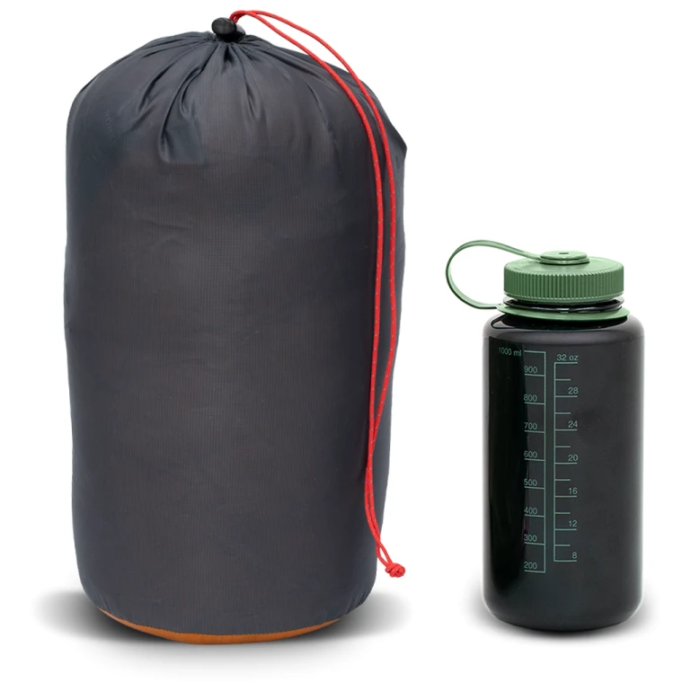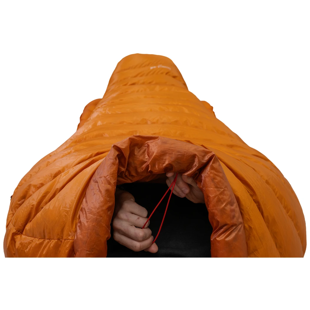 Конструкція оптимізує об'єм і теплову ефективність без зайвої громіздкості. Він має наповнювач з качиного пуху з пружністю 850 cuin і співвідношенням пуху 90/10, який чудово ізолює. Цьому сприяє термокомір нової форми, який щільно облягає плечі та запобігає втраті тепла. Капюшон має зав'язки з обох боків. Зручна форма 3D-мумії покращує теплоізоляцію та забезпечує комфорт. Простір навколо стоп спеціально оброблений у формі плавця акули, завдяки чому ноги можуть залишатися витягнутими в природному положенні протягом ночі, і має додаткову ізоляцію.
