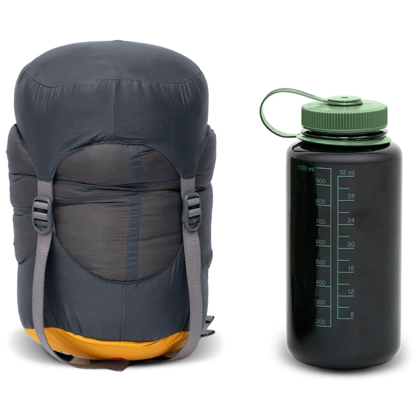 Спальник також має регульований еластичний поясний шнур для додаткової ізоляції, коли ви сидите в спальнику, і петлі для підвішування. Матеріали не містять PFAS, а в разі пуху відповідає сертифікату Responsible Down Standart, який гарантує добрі умови при розведенні тварин.