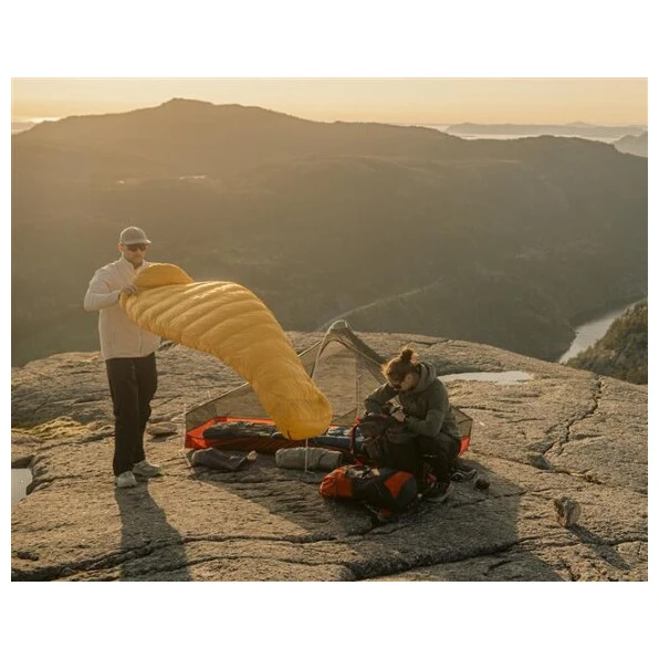 Він наповнений качиним пухом з наповнювачем 700 куін і співвідношенням пуху 95/5, що чудово ізолює. Цьому сприяє термокомір нової форми, який щільно облягає плечі та запобігає втраті тепла. Капюшон має зав'язки з обох боків. Зручна форма 3D-мумії покращує теплоізоляцію та забезпечує комфорт. Зона навколо стоп має спеціальну форму акулячого плавника, що дозволяє ногам залишатися витягнутими в природному положенні протягом ночі.