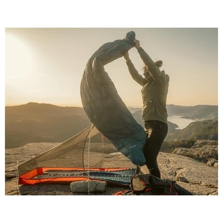 Спальник також має петлі для підвішування. Матеріали не містять PFAS, а в разі пуху відповідає сертифікату Responsible Down Standart, який гарантує добрі умови при розведенні тварин.