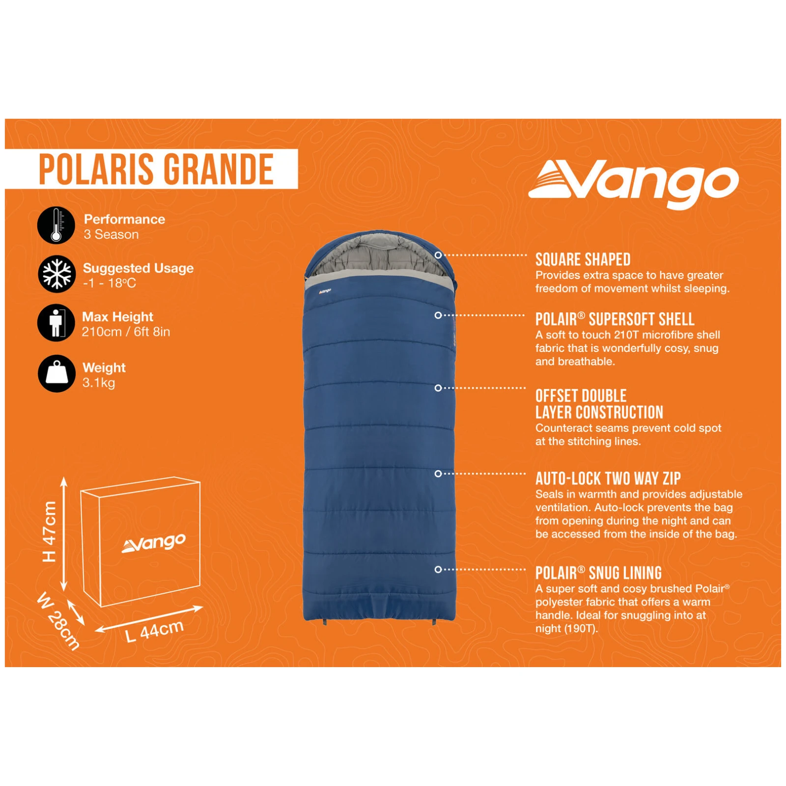 Спальний мішок Polaris Grande Vango - ідеальний вибір для туристів, які хочуть більше простору, тепла та комфорту, ніж пропонують стандартні одномісні спальні мішки. Модель Grande ширша і довша, що забезпечує вищий комфорт під час сну та достатньо місця для вільнішого руху.