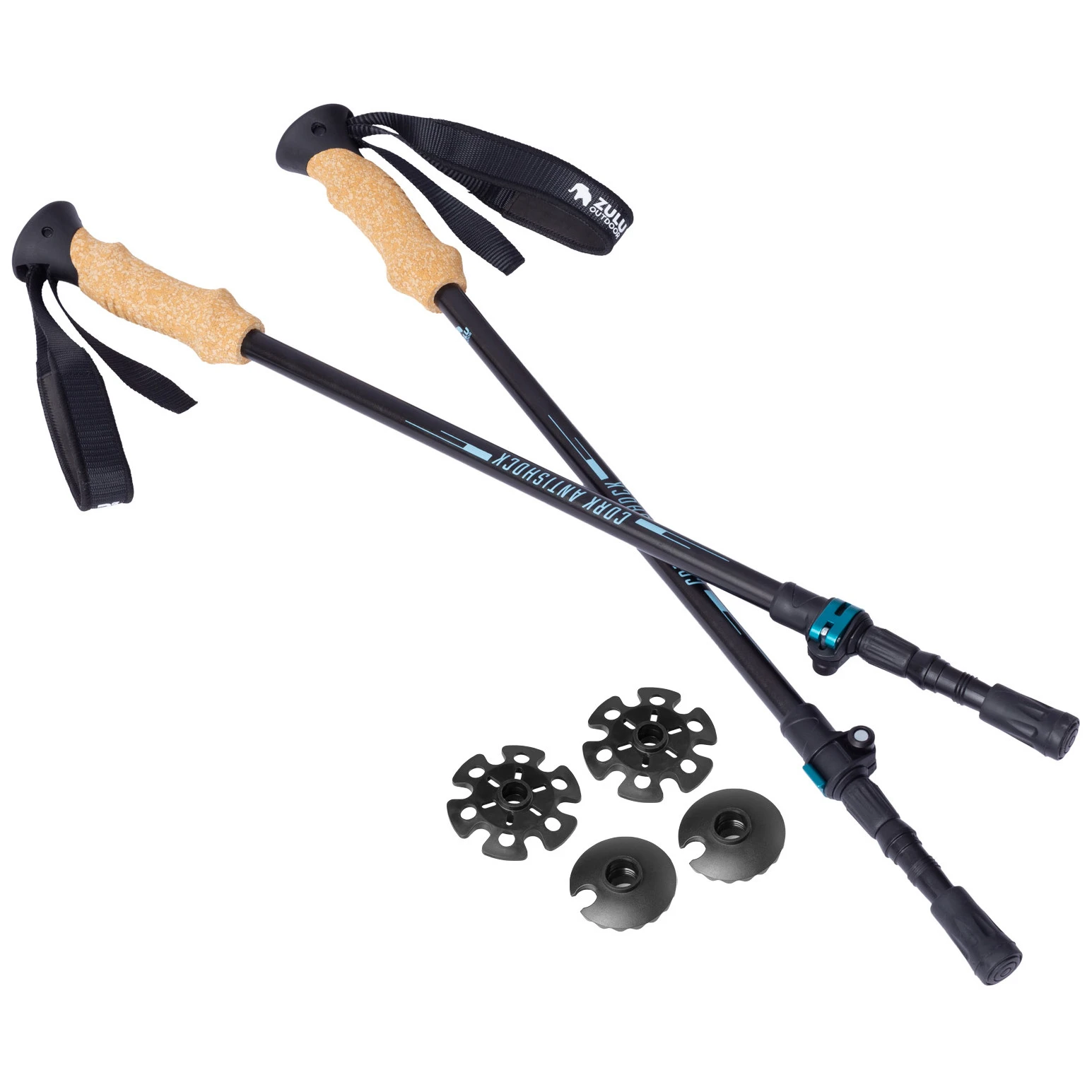 Zulu Cork Antishock — це трисекційні телескопічні палиці, розроблені для туризму, гірських походів і цілоденних вилазок по різноманітній місцевості. Конструкція з міцного алюмінію 7075 забезпечує ідеальне поєднання міцності та легкості, тому палиці надійно підтримують під час підйому та спуску.