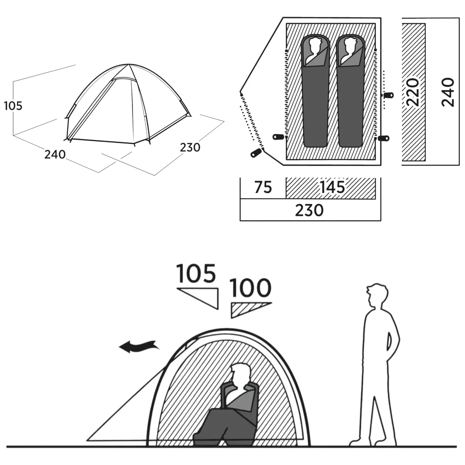 Встановлення намету відбувається швидко і легко. Алюмінієві дуги EnduraLight 7001 протягніть через тент, закріпіть у петлях і встановіть намет кілочками – за кілька хвилин він готовий до використання.