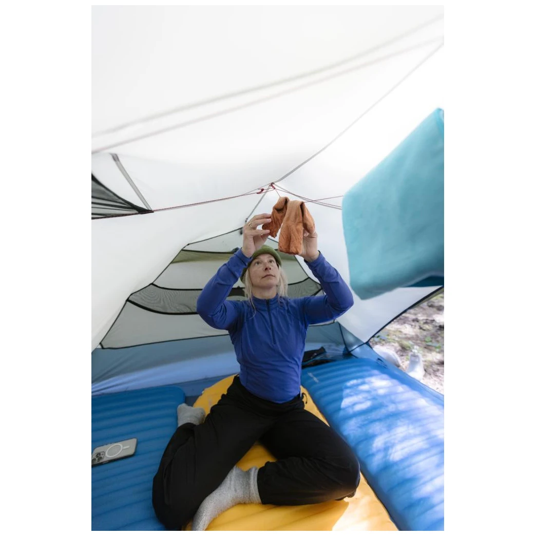 Намет використовує легкі та міцні дуги DAC NSL та самонесучу конструкцію з уніфікованою системою хабів, що дозволяє швидко та інтуїтивно встановлювати його. Практичні деталі, такі як велика стельова кишеня, інтегрована мотузка для сушіння спорядження або петлі для кабелів у кишенях, покращують організацію речей під час перебування в наметі. Мінімальна вага всього 2,20 кг особливо оціниться під час багатоденних походів, де важливе співвідношення ваги та простору.