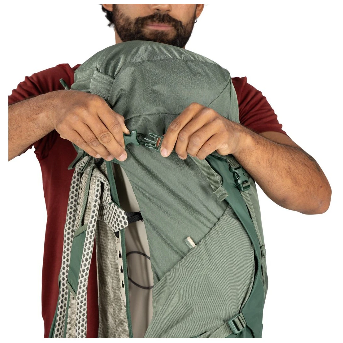 Сітчаста спинка створює простір між вашою спиною та рюкзаком. Повітря може вільно циркулювати, що покращує вентиляцію спини та пришвидшує випаровування поту. Недоліком є незначне зменшення внутрішнього об’єму та зміщений центр ваги.