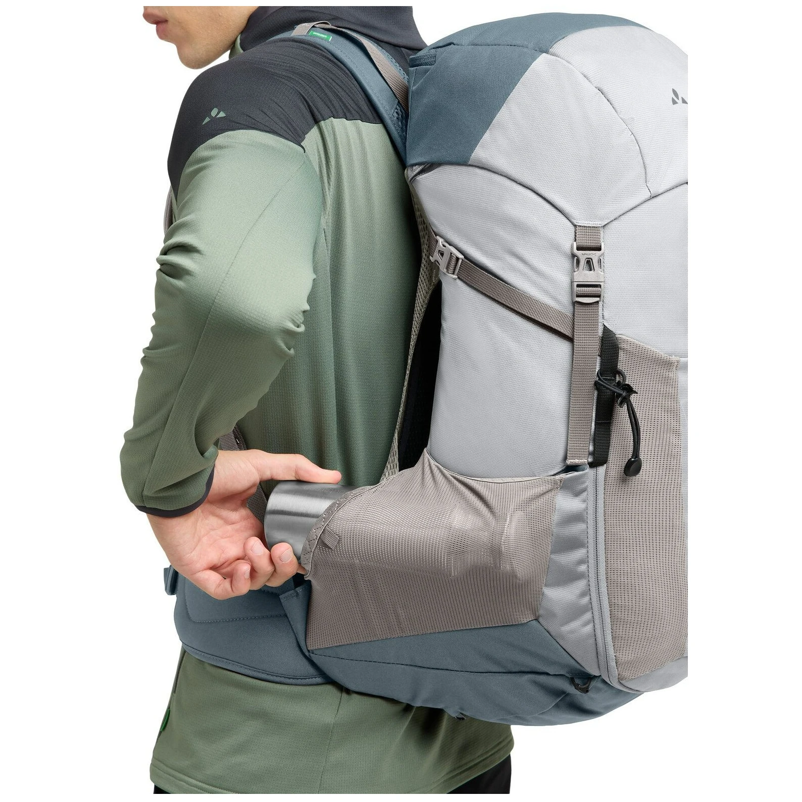 Поясний ремінь з кишенею на блискавці забезпечує стабільність і безпечне перенесення вантажу. Матеріал Eco Finish є стійким до води та бруду без PFC і виготовлений з переробленого PET. Маркування VAUDE Green Shape гарантує екологічне та функціональне виробництво.